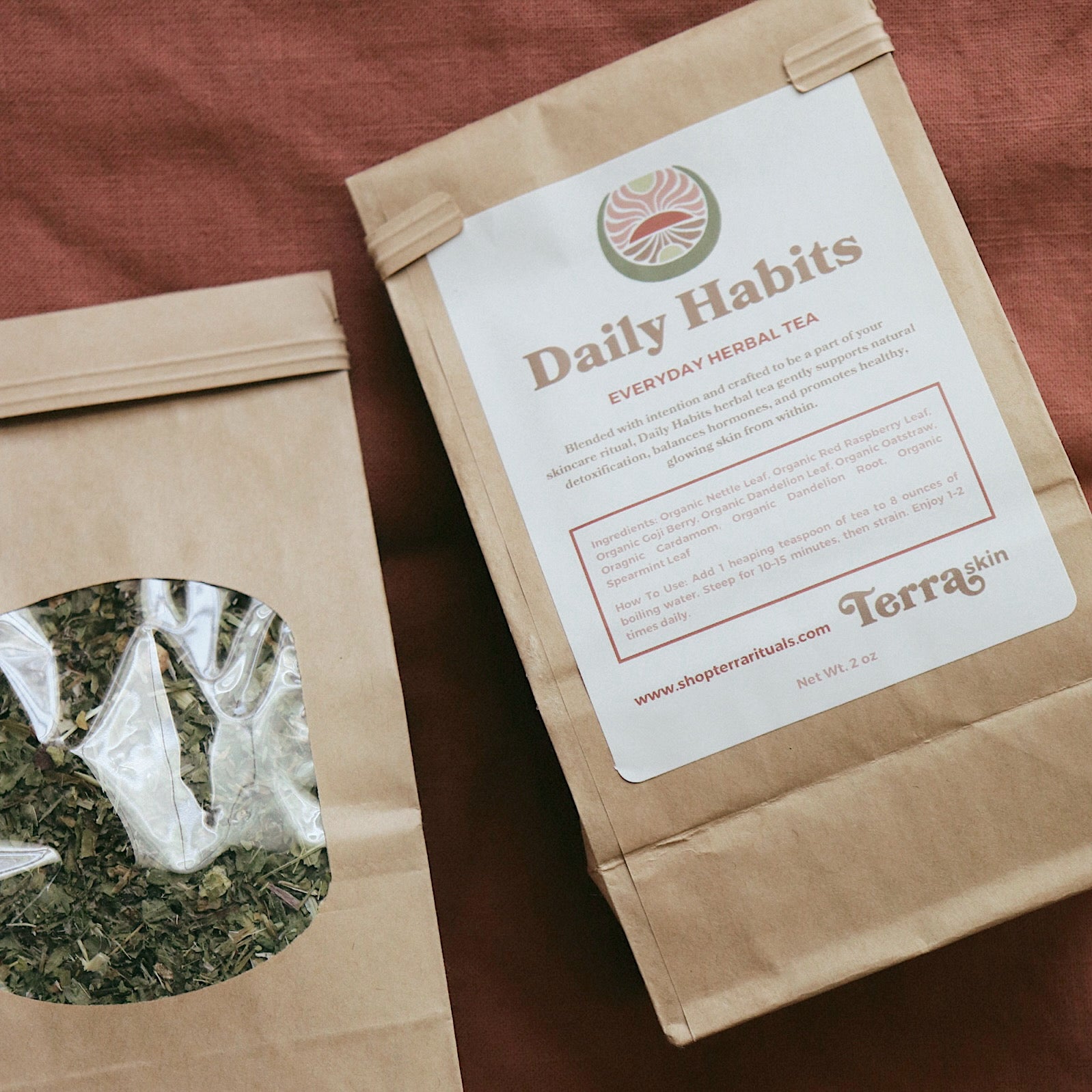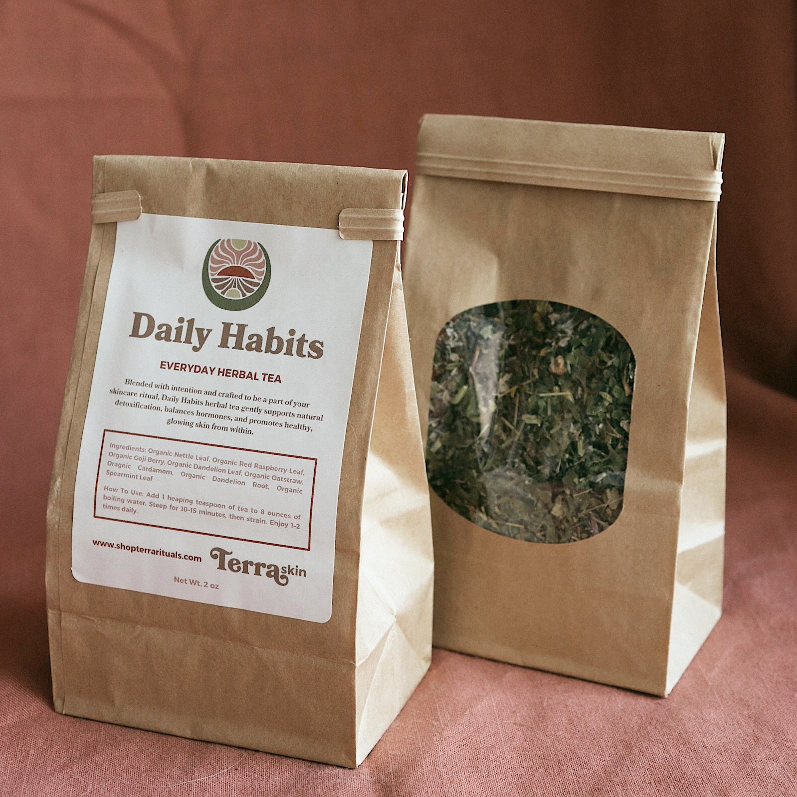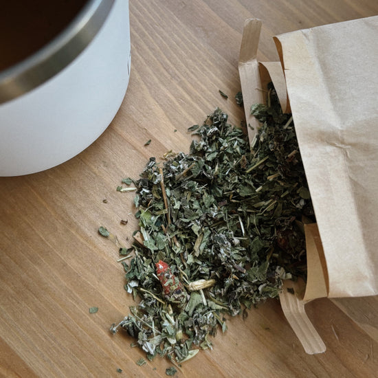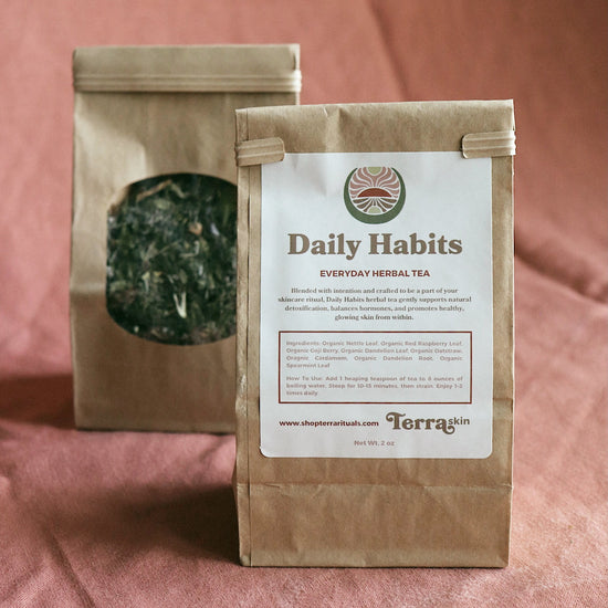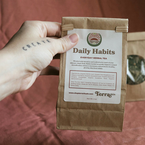 RED RASPBERRY LEAF // A well-known tonic for hormonal balance, red raspberry leaf helps regulate cycles and reduce hormonal acne. Its tannins support skin regeneration, while its rich mineral content—including magnesium, potassium, and iron—nourishes the body at a deep level.